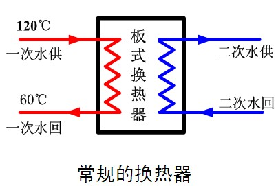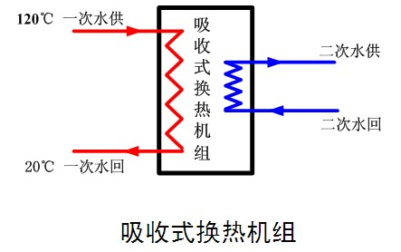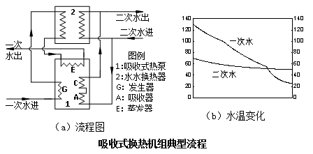 经过这样的组合流程,从外部看,可以看到吸收式换热机组达到了这样的效果:一次水温度逐级降低,最终降低至比二次水还低的温度;二次水逐渐被加热,最终达到需要的供热温度。