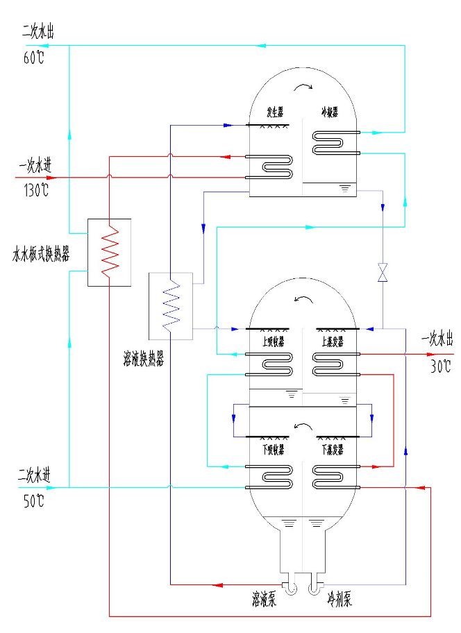 由于发生器、蒸发器内都发生将外部循环水降温的过程,而冷凝器、吸收器内的过程均为将外部循环水升温,所以可以让一次水依次通过发生器和蒸发器进行降温,让二次水依次通过吸收器和冷凝器进行升温。为了让热量互相匹配并达到更大的换热效果,需要在中间增加一个板式换热器。